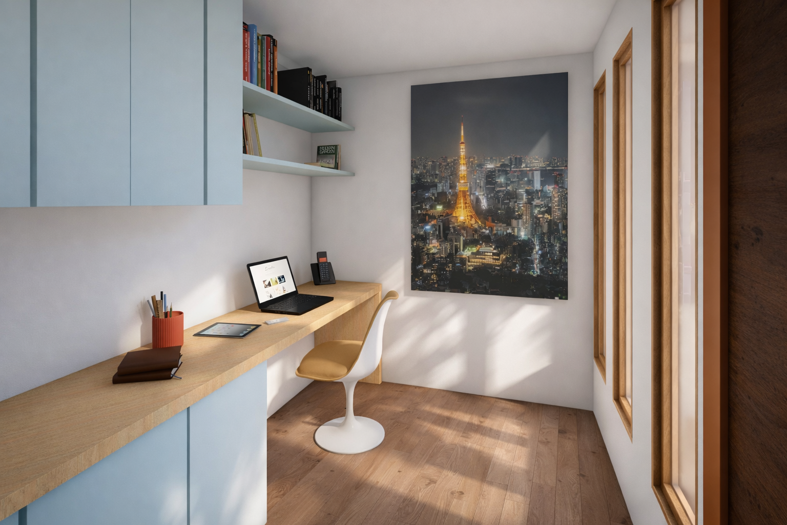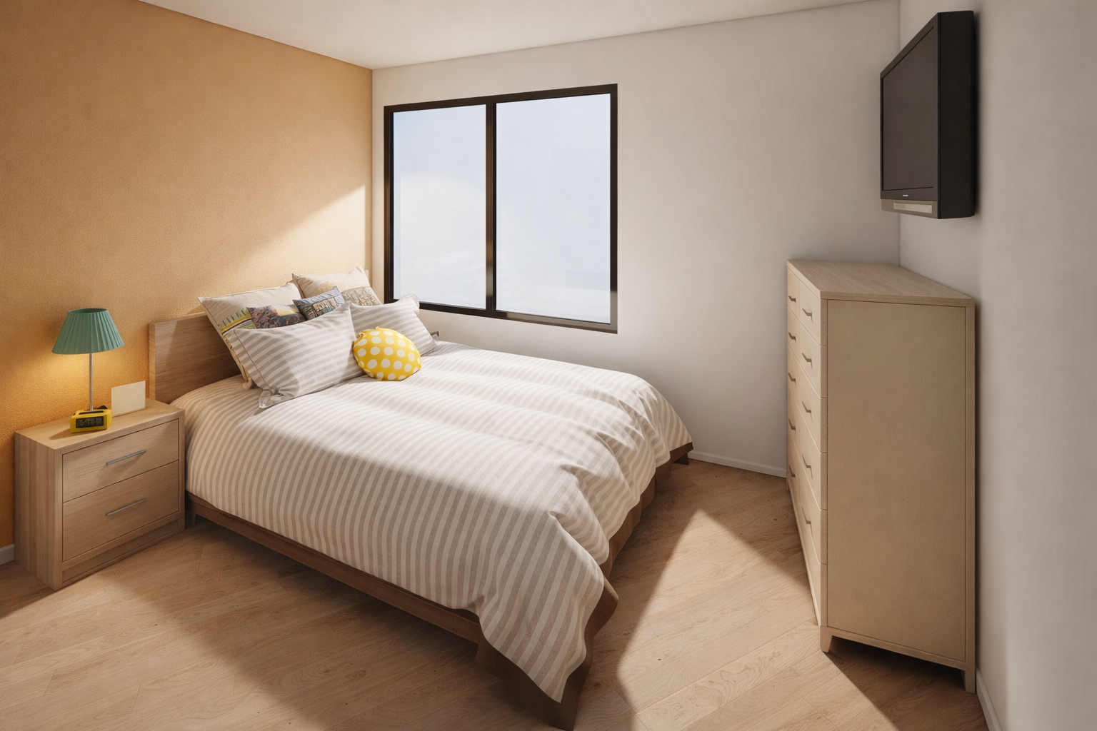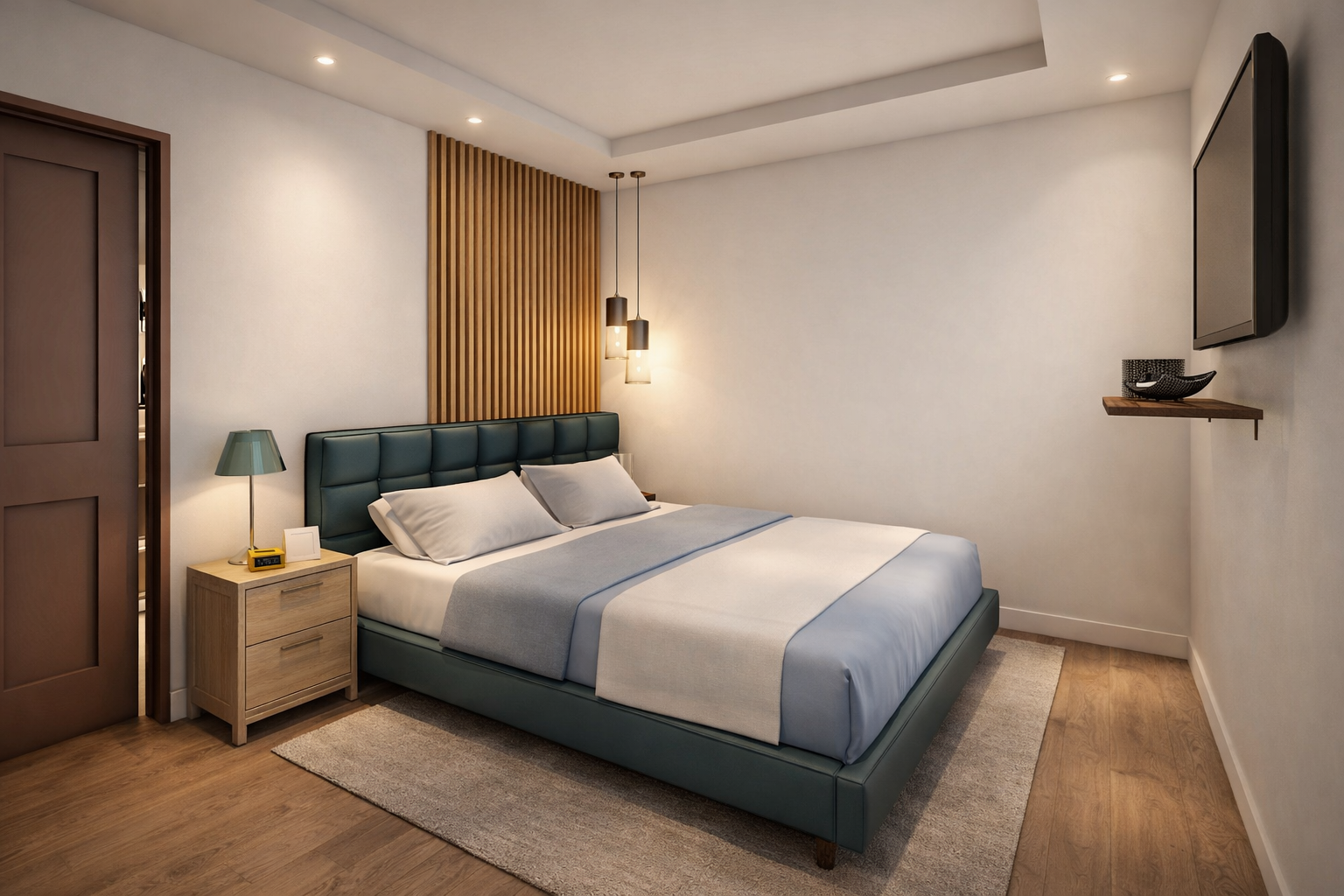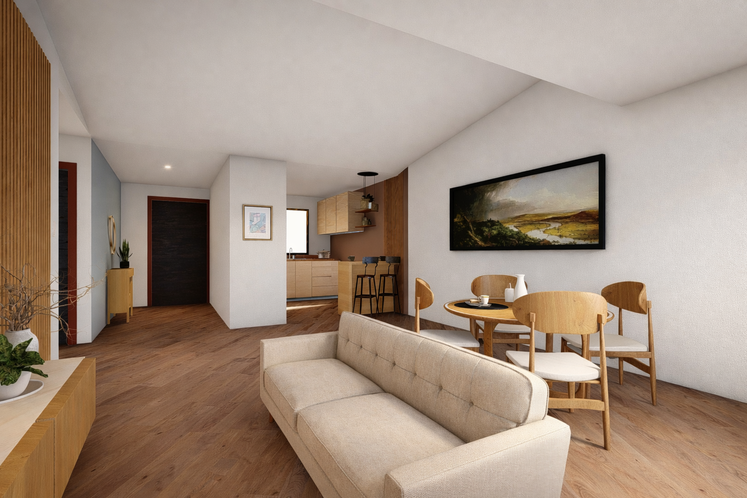 La propuesta busca generar ambientes luminosos y acogedores mediante el uso de materiales neutros, madera natural y detalles cálidos que aportan equilibrio y armonía al conjunto. Se incorporan soluciones de mobiliario y almacenamiento que optimizan el uso del espacio, manteniendo una imagen moderna y ordenada.